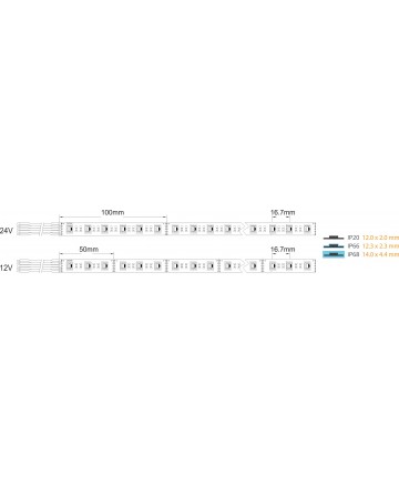 Ταινία LED για συνεχή λειτουργία, με φωτεινή απόδοση 110-120lm/W. Υπόστρωμα διπλής στρώσης PCB με πάχος χάλκινης τροχιάς 2 oz. Κολλητική ταινία 3M 300 LSE στο πίσω μέρος.