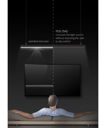 • Τα πλεονεκτήματα του φωτιστικού μπορούν να παρατηρηθούν καλύτερα με το μαύρο φινίρισμα του προφίλ. Συνιστούμε το ανοδιωμένο μαύρο σατέν φινίρισμα. Το εξάρτημα ελαχιστοποιεί τη λάμψη χωρίς να προκαλεί δυσφορία. Η πηγή φωτός κρύβεται στην εξώθηση PDS-ZMG που καθιστά τους μεγαλύτερους εσωτερικούς χώρους με μεγάλο αριθμό φωτιστικών πιο άνετα, καθώς τα μάτια σας δεν εκτίθενται στο πιο φωτεινό μέρος του φωτιστικού.